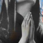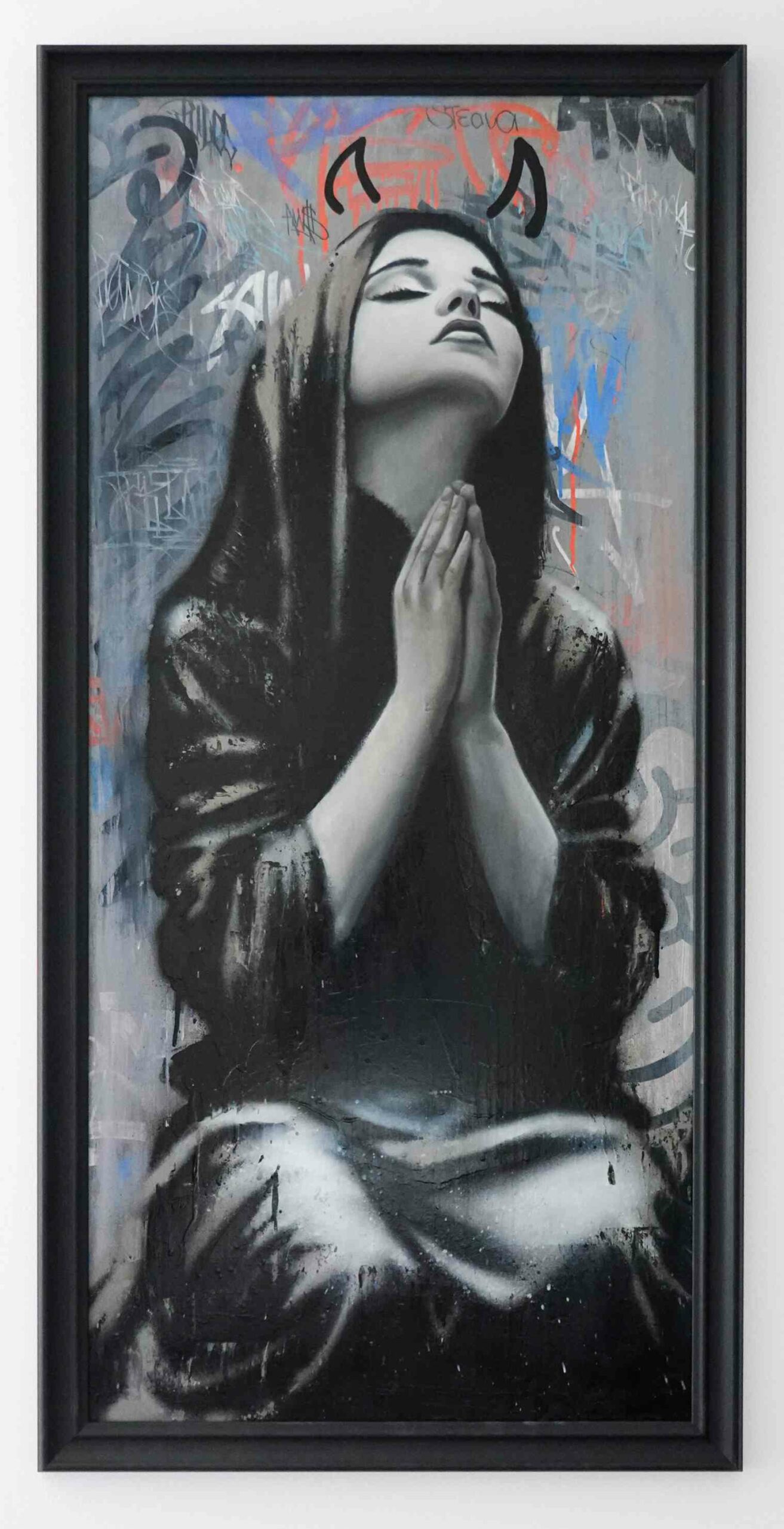 All We Sinners depicts a woman in prayer, rendered in grayscale oil to evoke classical religious imagery. Her serene posture contrasts sharply with the graffiti backdrop—vibrant tags and drips that challenge the sanctity of the scene. Black painted horns crown her head, disrupting the image of purity and inviting a dialogue between sin and sanctity.