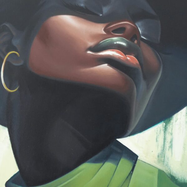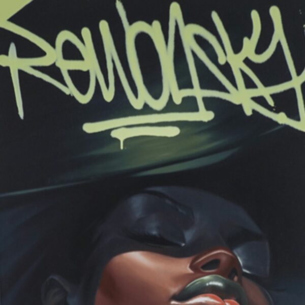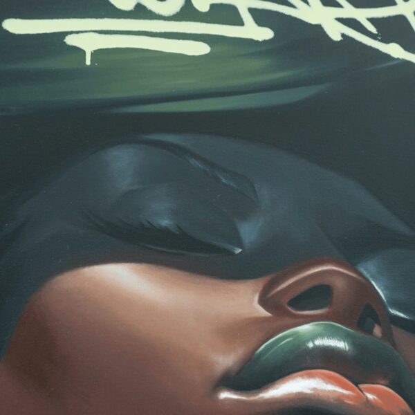 “DRIPPIN” takes its inspiration from characters often portrayed in abstract graffiti. This portrait depicts a glamorous Black woman, with vibrant abstract graffiti letters decorating the top of the piece.