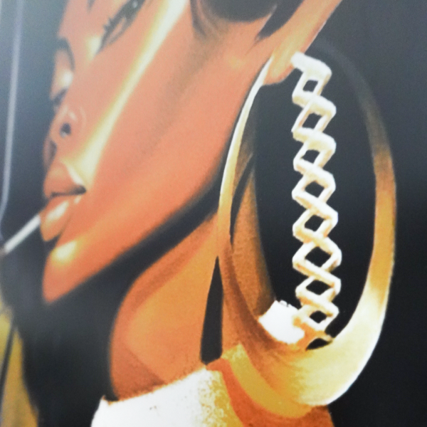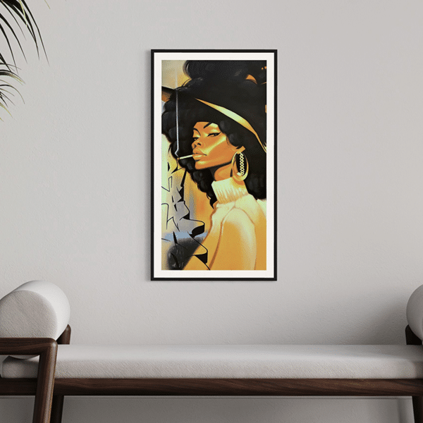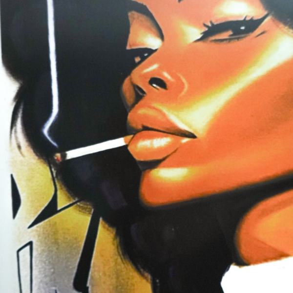 Limitierter Druck des gleichnamigen Gemäldes. Porträt einer glamourösen Frau, die eine Zigarette raucht, mit abstrakten Graffiti-Lettern.