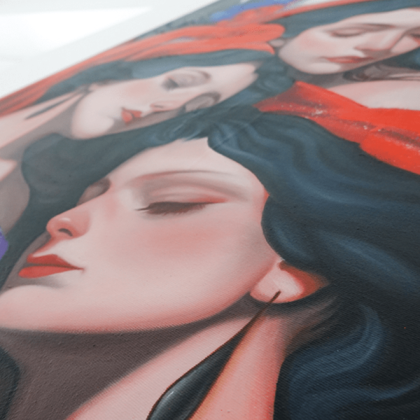 Eine zeitgenössische Neuinterpretation von Raffaels „Die drei Grazien". Die drei weiblichen Figuren stehen symbolisch für die Entwicklungsstufen der Frau – und für die mythologischen Gaben der Grazien: Heiterkeit, Eleganz und Schönheit.